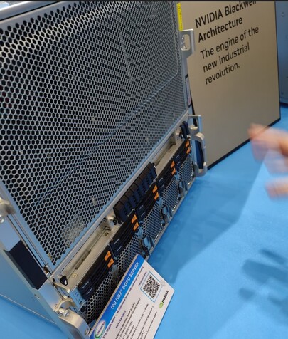 こちらのブースで人気だったのが、NVIDIAが生成AI用に開発したGPU:BlackwellとAIのために最適化されたサーバの「HGX B200 8-GPUベースシステム」の展示ブースでした。
